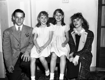 Visitors at the Southwestern Exposition and Fat Stock Show included the two sets of twins in the Mr. and Mrs. L. R. Kershaw family. At the far left and far right are Bobby and Betty Kershaw, 14, and in the center are Joan and Gene Kershaw, 8. The Kershaws are from Muskogee, Oklahoma. Bobby and Betty are knelt down on either side of Joan and Gene, who are seated. Bobby is wearing a suit. Betty is wearing a plaid coat over a dress with a lace collar. Gene and Joan are wearing matching, short-sleeve dresses.