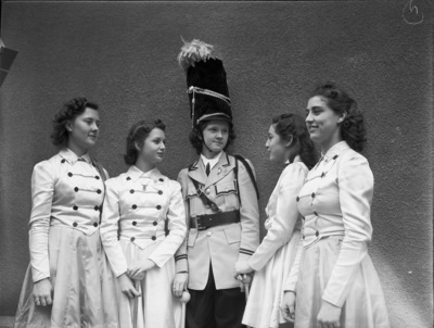 Post, Texas High School band members entertaining attendees at the Southwestern Exposition and Fat Stock Show include (left to right) Ms. Bernice Crisp, Ms. June Bowen, Wynona Sims and Ms. Iris Joy Parker and Ms. Wilma Redman. Attracting their share of attention were the five girl members seen in their uniform standing side by side each other.