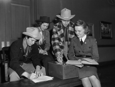 Ranch ladies at the Southwestern Exposition and Fat Stock Show's West Texas Art Show are (left to right) Mary Ellen Barton of Flomot, Texas, Helen Barron of Lamesa, Texas, and Marjorie Reagan of Beeville, Texas. Right is Mary Lake, secretary of the Fort Worth Art Association.