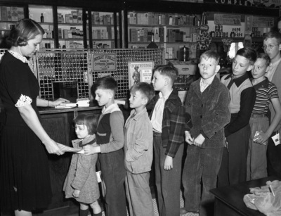 Pupils of Oral-Deaf Class of De Zavala Elementary School. They aren't able to hear the urgent appeals for defense stamp purchases but they see their duty plainly enough. They are getting in line and buying stamps from Mrs. Ruth Greenwood. Left to right, Ann Morgan, Jack Miller, Ivan White, Beverly Willson, Billy Frank Melton, Bert Poss, Charles Missildine and Clarence Phillips. Published on March 20, 1942.