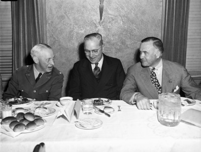 Attending a banquet at Hotel Texas sponsored by four horse breeders associations were, left to right, Colonel C. A. Wilkinson, of San Angelo, Texas, head of the Southwest Area of the United States Remount Service; Doctor W. G. Brock, of Dallas, Texas, president of the Texas Veterinary Medical Association, and James Goodwin Hall, of Fort Worth, Texas, president of the Quarter Horse Race Meeting Association of America. The three men are shown sitting at a dining table. On the table are several plates of food, glasses, and various silverware. Colonel Wilkinson is wearing a military uniform and the other two men are wearing suits. Doctor Brock is also wearing a pair of eyeglasses.