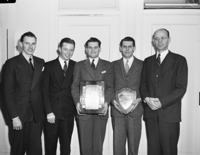 S. W. E. and F. S. S. University of Arkansas winning team in student judging contest. Left to right, Theodore Pfrimmer, Rogers, Arkansas; John Hubbard, Rogers, Arkansas; Ben McCollum, Emerson, Arkansas; Locke Edmondson, New Edinburg, Arkansas, and Phillip Kelly, coach.