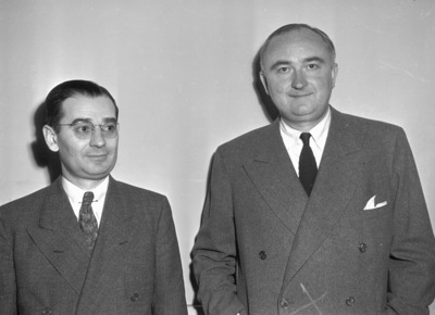 Consolidated Aircraft Corporation officials held a meeting in Fort Worth, Texas. Among the attendees were, left to right, R. A. Stanberry, of San Diego, California, secretary at Consolidated, and Donald McDonnell, of Los Angeles, California, one of the company directors. The men are standing against a bare wall, both wearing double-breasted suits. Mr. Stanberry is wearing eyeglasses.