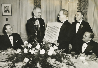 Recognition of civic leadership was made by members of the Fort Worth District Dental Society Monday night as they observed the one-hundredth anniversary of the first dental anniversary of the first dental college at the Fort Worth Club. Dr. F. E. Garrison is shown presenting a plaque to Amon Carter, left, who was described as "our chosen first citizen." Also in the photo are Dr. Claude Ward, Jr., vice president of the society, standing at Dr. Garrison's left, and Dr. Eugene Brown, seated. The presentation are to be made by local dental societies at the end of each 100 years. Monday's presentations, by more than 300 societies, were the first of their kind.