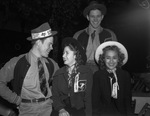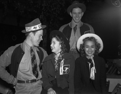 Southwestern Exposition and Fat Stock Show attendees and Texas Cowboy Reunion Boosters from Stamford Texas, are (left to right) Everett Million, Ms. Wanda White, Russell Gill, and Ms. Haleyon Stagner. All four of these young adults are seen wearing lettermen jackets, and hats. Each person has a sash reading Stamford either on their hat or jacket.