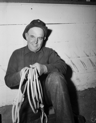 Bob Crosby, holding ropes at the Southwestern Exposition and Fat Stock Show.