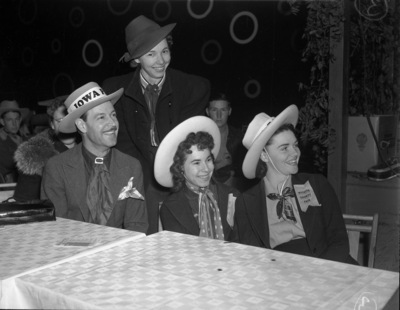 Southwestern Exposition and Fat Stock Show delegation members from Iowa Park include (left to right) Leroy Nichols, Mrs. R. E. Van Horn, Miss Anoham Benton and Miss Micky Reeder, are seen sitting around a table wearing suit jackets and a hat reading Iowa Park. There are people in the background looking on.