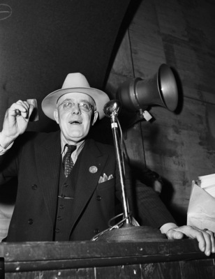 Earl Gartin, auctioneer, at the microphone at the Southwestern Exposition and Fat Stock Show.