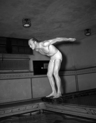 The Texas Christian University (TCU) swimming team is depending on this ace diver for points in the big tank meet being held in connection with the Southwestern Exposition Carnival. The swimmer is Johnny Byrnes. He will meet some of the country's best in the finals at the TCU pool. Byrnes is wearing swim trunks and standing on the edge of a diving board.