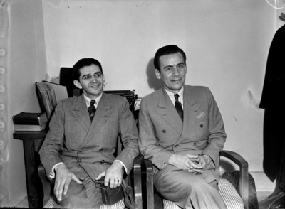 Visitors from South America who attended the Southwestern Exposition and Fat Stock Show in Fort Worth, Texas, included, left to right, Edgar Oliveira Regis, of the department of agronomy, cotton division, state of Bahia, Brazil, and Nuno Tavares, also of Bahia, Brazil, director of the agronomy department. The two men are shown sitting in chairs in an office setting. Behind them is a desk with a variety of books stacked on top of it. Both men are wearing double-breasted suits and have their legs crossed as they sit. Regis is wearing a pair of eyeglasses and holding a bag in his left hand. He is looking off to his left while Nuno looks at the camera.