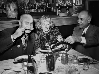 Barbecue dinner given by Colonel Kilpatrick was attended by (right to left) Amon Carter, Myrtle Goodrich and Colonel J.R. Kilpatrick. Mr. Carter holding a plate of meat that he and Mrs. Goodrich are taking from while Colonel Kilpatrick has a piece of meet with bone in his mouth and he is holding it with his right hand. They are all smiling. Mr. Carter is looking at Colonel Kilpatrick who is looking at the camera while Mrs. Goodrich is looking at the plate of meat. They have plates of food and drinks on the table in front of them. Behind them in the background is a counter with different beverages on and behind it.