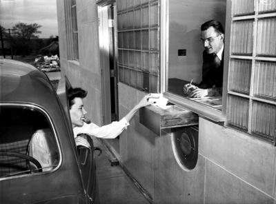 Mrs. Lillian McMurray Moore, bank stenographer, and S. M. Payne, assistant cashier, demonstrate how curb service will be given at the new First National Bank building at Grapevine, Texas. Mrs. Moore is in a car that is parked by the curb service area of the building. She is leaning out of the driver side window and placing some checks in the sliding metal tray while she communicates with Mr. Payne, who is inside the building, over a two way speaker system. The glass in front of Mr. Payne is an inch thick and bulletproof. Mr. Payne is wearing a dark suit and a pair of eyeglasses and Mrs. Moore is wearing a long-sleeve blouse.