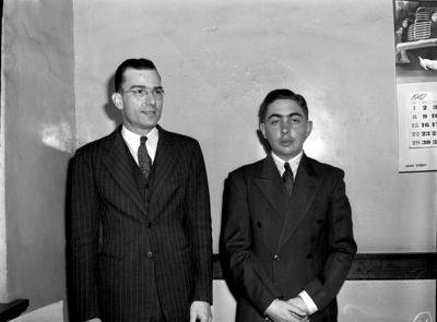 Employees of the new First National Bank at Grapevine, Texas, include, left to right, S. M. Payne and Edwin Sams. Payne is a cashier and Sams is an assistant cashier and clerk. The two men are standing in front of a wall. Payne is wearing a striped suit and a pair of eyeglasses and Sams is wearing a dark, double-breasted suit. Sams's hands are folded in front of him and Payne's are at his sides. Hanging on the wall behind them, at right, is a calendar (partially obscured).