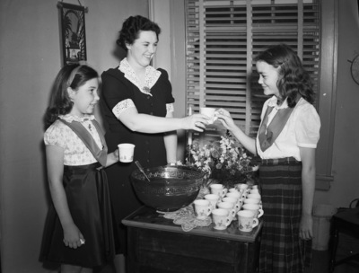 The Camp Fire Girls held a birthday tea. at their headquarters in the Majestic Building. Alma Carolyn Geren, left, and Jane Bullock, right, are receiving cups of punch from Miss Louise Fargher, Camp Fire Executive. The affair was to celebrate the twenty-eighth anniversary of the national association. Alma Carolyn is the president of the Otyokwa group. She is dressed in a frilly blouse, the Camp Fire Girls sash, and a skirt. Miss Fargher is wearing a button-up dress with lace around the collar and sleeves and a brooch. Jane is the head of the Cantewastya group. She is dressed in a collared blouse, a sash, and a plaid skirt.
