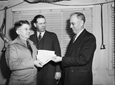 John B. Davis, right, manager of the Southwestern Exposition and Fat Stock Show, handing several checks worth $1,502 to Houston Hutchens, left, chairman of the livestock and industrial division of the Red Cross campaign, as A. K. Mackey, center, watches. Davis and Mackey are wearing dark suits and Hutchens is wearing a zipped up jacket over his shirt and tie. All three men are also wearing eyeglasses. Behind them is a window with the blinds closed. The checks came from the sale of two steers at the livestock show.