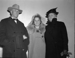Southwestern Exposition and Fat Stock Show visitors Mr. and Mrs. Jim Minnick and daughter Peggy, of Crowell, Texas. Miss Minnick seen linking arms with parents, was one of the ranch girls honor guests at the exposition last year. Minnick will judge draft horses at the show.