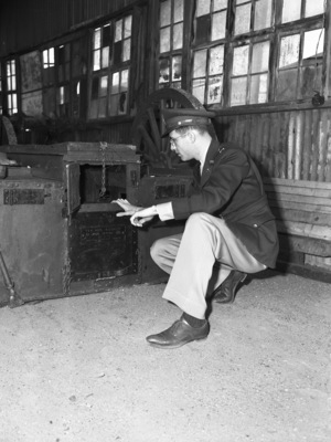 Lieutenant W. H. Brown, headquarters commander of the 27th Battalion, Texas Defense Guard, inspects mobile kitchen units.