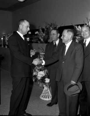 Celebrating the opening of the new First National Bank in Grapevine, Texas, were, left to right, D. E. Box, president of the bank, and D. E. Saunders, vice president. The two men are shaking hands and are both wearing dark suits. Box is also wearing eyeglasses. Mr. Saunders is holding his hat in his left hand and Mr. Box is holding a cigar. Standing behind Saunders are two unidentified men, both dressed in suits. Behind the group of men are several bouquets of flowers displayed around the room. The bank was opened for inspection by visiting bankers and fellow townsmen.