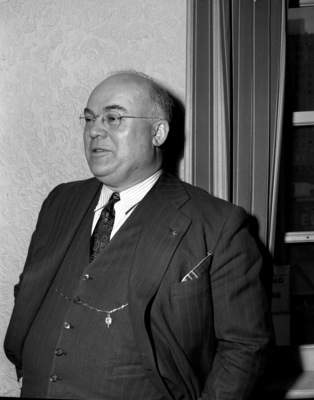 E. H. Paine, of Michigan City, Indiana, first vice president of Lions International. Mr. Paine is shown standing in front of wall with a curtained window. He is wearing a dark, three-piece striped suit and a pair of eyeglasses. Paine was in Fort Worth, Texas, to give a speech at a local Lions' zone meeting.