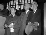 Southwestern Exposition and Fat Stock Show visitors (left to right) Doctor B. F. Thielen, Pat Mayse, publisher of Paris News; and R. C. Lane, all of Paris, Texas, seen standing side by side each other wearing suits, as they look on.