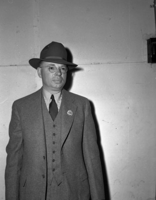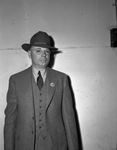 Southwestern Exposition and Fat Stock Show visitor Kent M. Weaver, Concord, California, is seen standing in front of a wall, wearing a suit, and a hat. Weaver has been interested in the Palomino horse since he was a boy and is regarded as one of the best known judged of Palomino horses on the Pacific Coast.