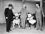 Stock Show. Amon Carter and groups with champion livestock.There are two unidentified men holding on to the lead of two different steers with Amon Carter standing in the center. The men are wearing suits, ties, dress shoes and hats. Amon Carter and the man beside him to the right of the picture are holding canes. The men are smiling as they look at the steers