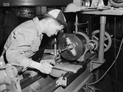 Bomber Plant Edition. North Texas Agricultural College (N. T. A. C.) wartime efforts. David Bothwell learning how to use a lathe.