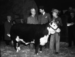 Stock Show. Stock Show. In the photograph, Amon Carter Senior and Junior are standing behind a steer and beside them is an unidentified young man. The steer is multi colored. Mr. Carter Sr. and Mr. Carter Jr. are wearing suits, ties, inner collared shirts and hats. The unidentified man is wearing a jacket, an inner shirt, pants, neckerchief and a hat. The man and Mr. Carter Jr. are looking at Mr. Carter Sr. who is looking at the unidentified man. They are standing outdoors. In the background, there are unidentified people having conversations and some are reading pamphlets.