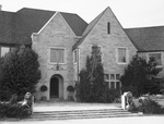 Exterior shot of the Stanley and Clara Thompson residence. Seventeenth and eighteenth century English manor houses provided the inspiration for the home. The architecture is late Elizabethan and the interior and furnishings are eighteenth century, with adaptations. British Lions, in duplicate, guard the wide steps of the flagstone terrace from which the home is entered on the east. Mullioned windows and half-timbered sections are typical Elizabethan details which add charm to the exterior. The roof is of tile, hand-made to simulate the hand-rived shakes with which original Elizabethan mansions are roofed.