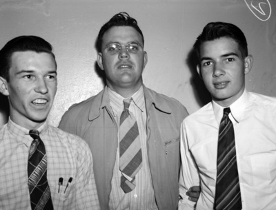 John Whitfield, center, is the assistant Tarrant County farm agent in charge of boys' 4-H Club work. Cullen Thomas, of Everman, Texas, left, and Alfred Crouch, of Sycamore, Texas, right, are both members of the Tarrant County dairy judging team which placed third at the Southwestern Exposition and Far Stock Show and won other honors. The young men are standing against a bare wall. All three are wearing button-down shirts and neckties. Mr. Whitfield is wearing a sports coat and eyeglasses.