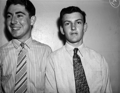 Joe Crouch, of Crowley, Texas, left, and Johnny Arterbury, of Everman, Texas, are members of the Tarrant County dairy judging team and have several 4-H accomplishments. They are standing against a blank wall, both wearing button-down shirts and neckties.