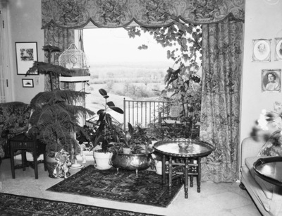 The solarium at the Stanley and Clara Thompson residence. Seventeenth and eighteenth century English manor houses provided the inspiration for the home. The architecture is late Elizabethan and the interior and furnishings are eighteenth century, with adaptations. The solarium room is decorated with a rubber tree and some other plants, and framed portraits on the wall. It has a large picture window, framed in a bougainvillea vine.