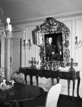 Seventeenth and eighteenth century English manor houses provided the inspiration for the home of Mr. and Mrs. Stanley A. Thompson. The architecture is late Elizabethan and the interior and furnishings are eighteenth century, with adaptations. Family portraits are used as integral parts of the interior decoration. Four portraits of Mr. and Mrs. Thompson and their daughter, Mrs. Curtis Durham, and son, John Thompson, recently have been completed by Dr. Josef Stegall, Viennese artist. Mr. Thompson’s portrait is hanging in the dining room. The frame, hand carved, and covered in gold leaf, is an eighteenth century English antique. Also shown in the dining room is an end table lined with candelabras, and a chandelier hanging above the dining table.