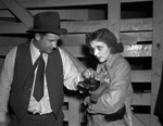 Southwestern Exposition and Fat Stock Show visitors W. O. Reeves and Pauline Nesbitt, are standing in a barn next to each other. Pauline is holding a dog in her arms, and Reeves is seen petting the head of the animal.