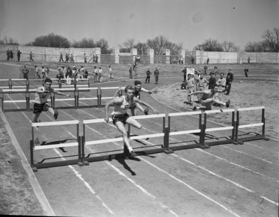 The Southwestern Exposition and Track Meet kicked off Friday in Fort Worth, Texas. R. W. Cummins, Schreiner Institute's steeplechaser, is shown in the lead as he clears one of the middle hurdles. He went on to win the junior college high hurdles with a time of fifteen seconds flat. J. Bergman, left, is also a student at Schreiner. He placed second in the race.