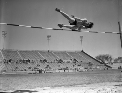 The Southwestern Exposition and Track Meet kicked off Friday in Fort Worth, Texas. Participating in the college events is Don Boyston of Oklahoma A. & M. Boyston is competing in the high jump. He is illustrating the tremendous acrobatics that go into clearing the bar at six feet, eight inches. Later Boyston tried to set the American collegiate record height of six-feet, ten inches but missed by only a little "elbow drag". People are sitting in the stands of Farrington Field, watching the events.