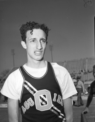 The Southwestern Exposition and Track Meet kicked off Friday in Fort Worth, Texas. Participating in the college events is Don Boyston of Oklahoma A. & M. Boyston is competing in the high jump. He won the event, clearing the bar at six feet, eight inches. Later Boyston tried to set the American collegiate record height of six-feet, ten inches but missed by only a little "elbow drag". Boyston is wearing a t-shirt with "Aggies" and an "O" across the chest.