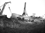 Image shows a Train Wreck. Scenes of the wreckage after two-Missouri-Kansas-Texas Railway locomotives side swiped at the "cross-over." Two men were injured and one engine overturned. spectators are shown looking upon the a turned over train while a crane is pulling the wreckage. Published in the fort worth Star-Telegram morning edition April 10, 1942.
