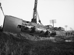 Image shows a Train Wreck. Scenes of the wreckage after two-Missouri-Kansas-Texas Railway locomotives side swiped at the "cross-over." Two men were injured and one engine overturned. spectators are shown looking upon the a turned over train while a crane is pulling the wreckage. Published in the fort worth Star-Telegram morning edition April 10, 1942.