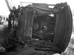 Image shows a Train Wreck. Scenes of the wreckage after two-Missouri-Kansas-Texas Railway locomotives side swiped at the "cross-over." Two men were injured and one engine overturned. spectators are shown looking upon the a turned over train while a crane is pulling the wreckage. Published in the fort worth Star-Telegram morning edition April 10, 1942.