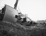 Image shows a train wreck. Scenes of the wreckage after two Missouri-Kansas-Texas Railway locomotives side-swiped at the "cross-over." Two men were injured and one engine overturned. Spectators are shown looking upon the turned over train. Published in the Fort Worth Star-Telegram Morning Edition April 10, 1942.