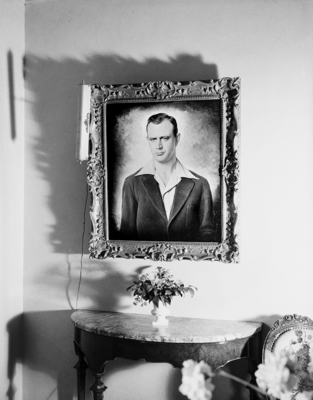 Image shows seventeenth and eighteenth century English manor houses provided the inspiration for the home of Mr. and Mrs. Stanley A. Thompson. The architecture is late Elizabethan and the interior and furnishings are eighteenth century, with adaptations. Family portraits are used as integral parts of the interior decoration. Four portraits of Mr. and Mrs. Thompson and their daughter, Mrs. Curtis Durham, and son, John Thompson, recently have been completed by Dr. Josef Stegall, Viennese artist. The frame, hand carved, and covered in gold leaf, is an eighteenth century English antique. Also shown is an end table lined with candelabras. Published in the Fort Worth Star-Telegram Sunday edition April 28, 1940.