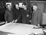 Big Bend Park. Examining the map, left to right Frederik Isely, Austin, Texas; J. Edward Johnson, Brownwood, Texas; A. T. Barrett, Alpine, Texas, Max Bentley, Abilene, Texas. They all wear suits and look at the map on the table. Published on April 12, 1942.