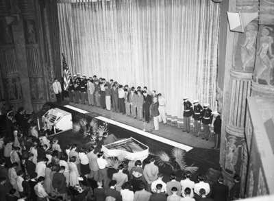 Public induction of 22 men into the Marine Corps. "The induction of 22 men into the United States marines on the stage of the Worth Theater last Saturday night was an impressive sight, as this picture indicates. The ceremony was held in connection with the showing of "To the Shoes of Tripoli," a story of the marine corps. Several officers of the corps took part in the ceremony." The first few rows are fill with people who are standing. The stage is nearly full, with most of the people in formal wear, but several are wearing military uniforms. Nearly everyone's head is down, perhaps they are observing a moment of silence. There are both an organ and piano in the orchestra pit, along with a few potted palms. Art Deco columns frame the stage.
