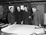 Image shows members of the Texas State Parks Board examining the map of Big Bend Park. From left to right, Frederik Isely, Austin, Texas assistant attorney general; J. Edward Johnson, Brownwood, Texas, associate counsel for the board; A. T. Barrett, Alpine, Texas, appraiser for the board; and Max Bentley, Abilene, Texas, activities director of the West Texas Chamber of Commerce. They all wear suits and look at the map on the table. Published in the Fort Worth Star-Telegram morning edition April 12, 1942.