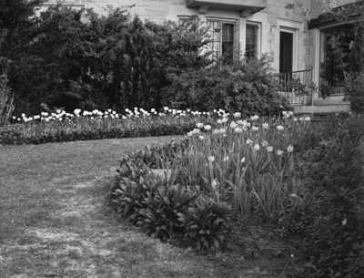 Image shows seventeenth and eighteenth century English manor houses provided the inspiration for the home of Mr. and Mrs. Stanley A. Thompson. The architecture is late Elizabethan and the interior and furnishings are eighteenth century, with adaptations. The garden, which is really a series of gardens of different levels, also is an adaptation of the landscape design of the English period. Pictured is a corner of the garden which is now blooming with tulips. The grounds are bright with a succession of blooms from early spring through chrysanthemum time. Published in the Fort Worth Star-Telegram Sunday edition April 28, 1940.