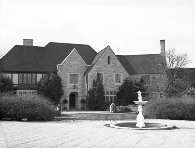 Image shows a exterior shot of the Stanley and Clara Thompson residence. Seventeenth and eighteenth century English manor houses provided the inspiration for the home. The architecture is late Elizabethan and the interior and furnishings are eighteenth century, with adaptations. British Lions, in duplicate, guard the wide steps of the flagstone terrace from which the home is entered on the east. Mullioned windows and half-timbered sections are typical Elizabethan details which add charm to the exterior. The roof is of tile, hand-made to simulate the hand-rived shakes with which original Elizabethan mansions are roofed. Published in the Fort Worth Star-Telegram Sunday edition April 28, 1940.