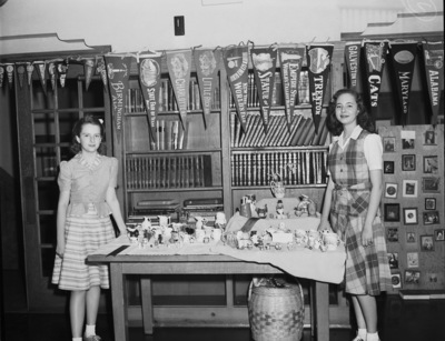 Among the participants in the W. P. McLean Junior High School hobby show were Marian Neeley (left) and Mary Elizabeth McKinney. The students are standing at opposite sides of a table. Displayed on the table is an assortment of a small teacups and jugs. Marian is wearing a striped dress. Mary Elizabeth is wearing a plaid print dress. Behind them is a bookshelf. Strung up across the bookshelf is a row of pennant flags.