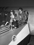 Lady Halifax exiting an airplane holding a bouquet of bluebonnets with an unidentified man.