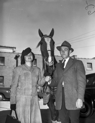 Southwestern Exposition and Fat Stock Show attendees Mr. and Mrs. Charles Judd of Dallas, Texas, with Mrs. Judd's mount,"Sir Step Alone". The couple, also known as the bride and groom of the horse show, is seen standing in front of a horse with both of their hands placed on the leash.